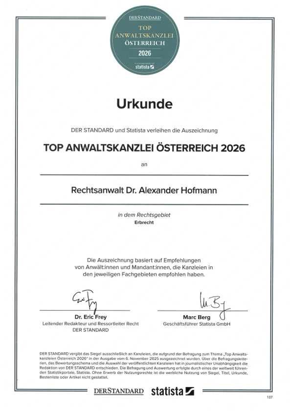 +++ Unsere Kanzlei wurde mit 5 Sternen im Ranking „Top-Anwaltskanzleien Österreichs 2026“ der Tageszeitung DER STANDARD im Erbrecht ausgezeichnet.